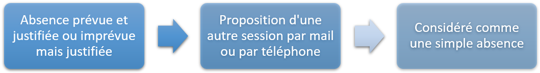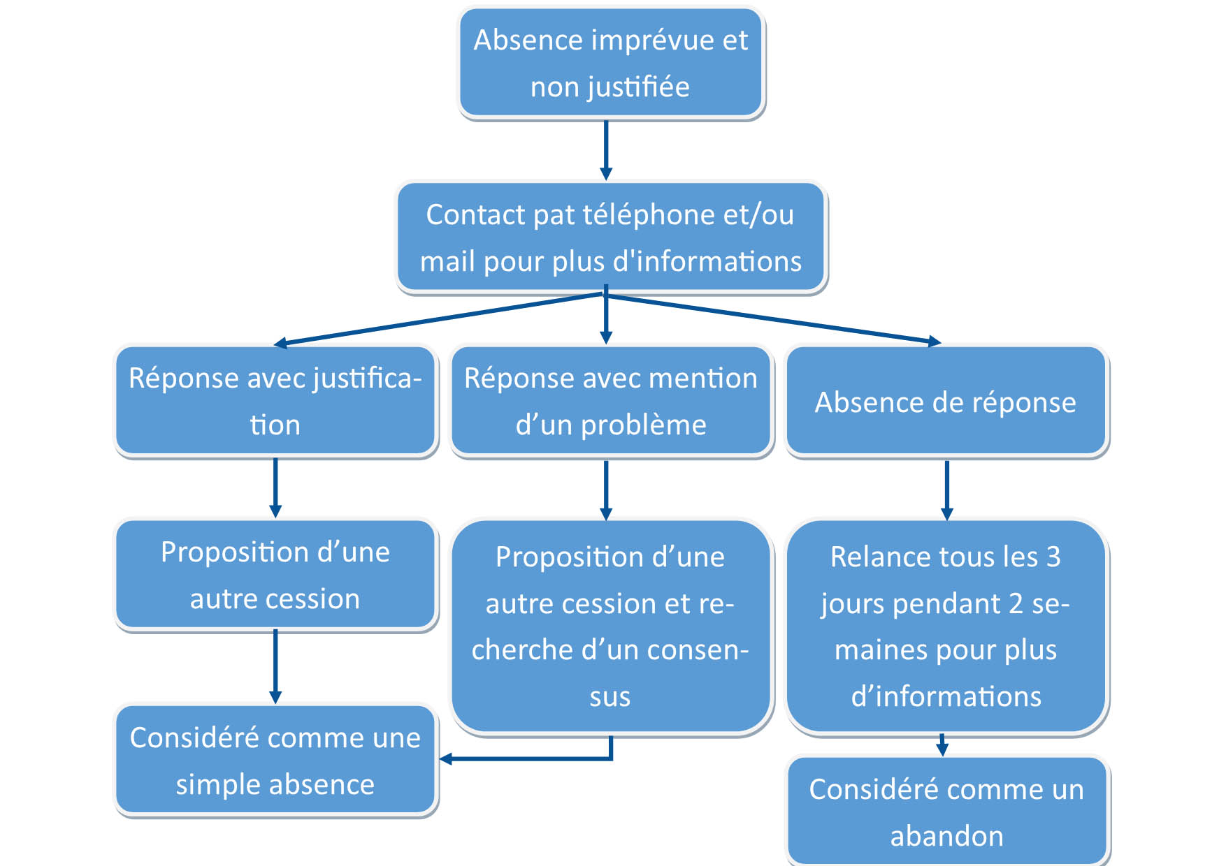 En ce qui concerne la gestion des absences, nous nous assurons de remplir des feuilles de présence pour chaque journée de formation. Nous disposons également d’un processus de gestion des absences que voici :